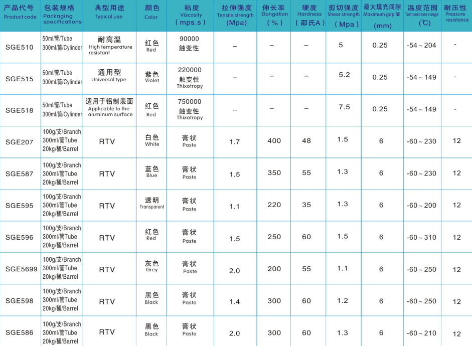 ◆RTV脱肟固化、通用型、低气味、低延伸率、耐润滑油。